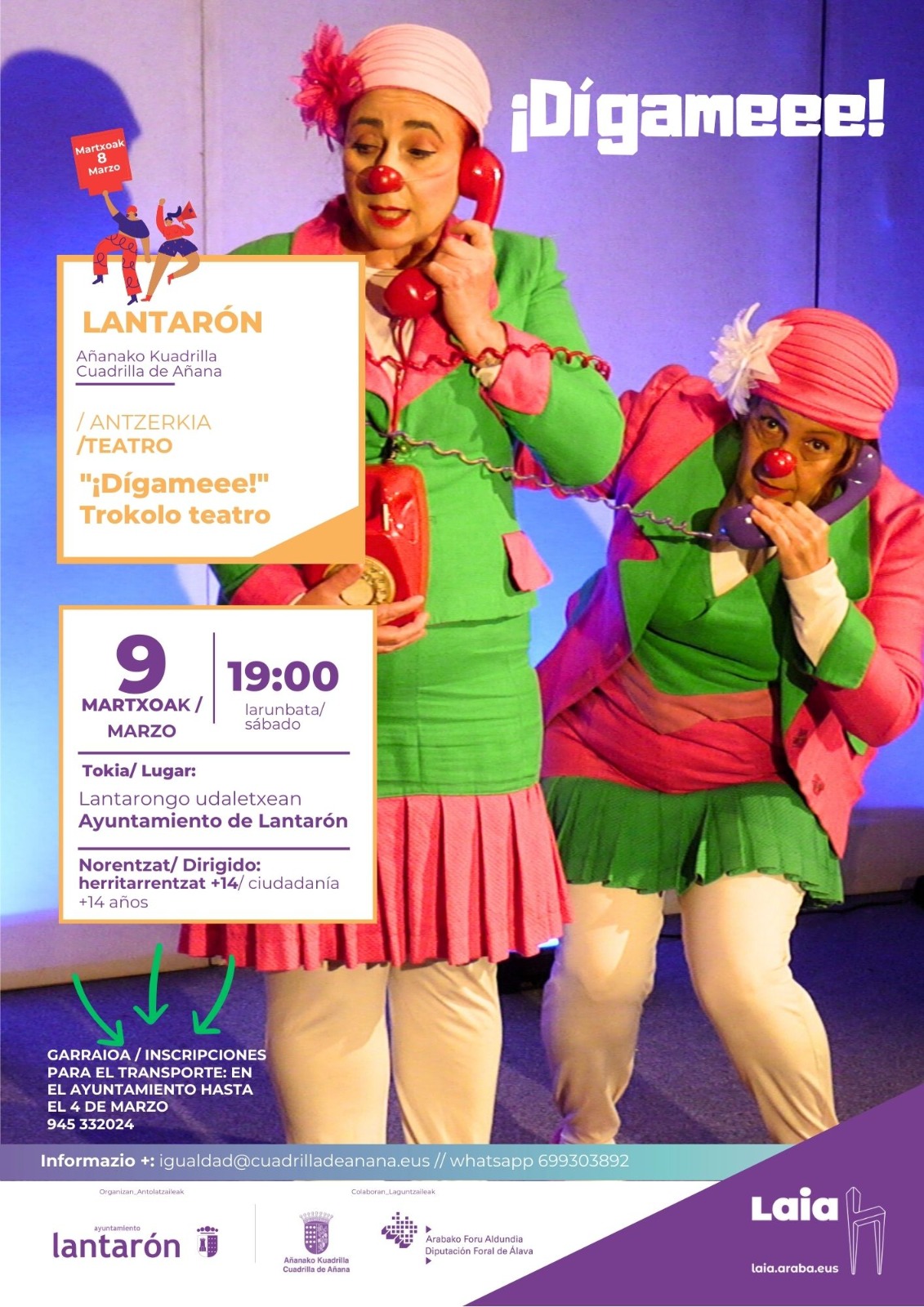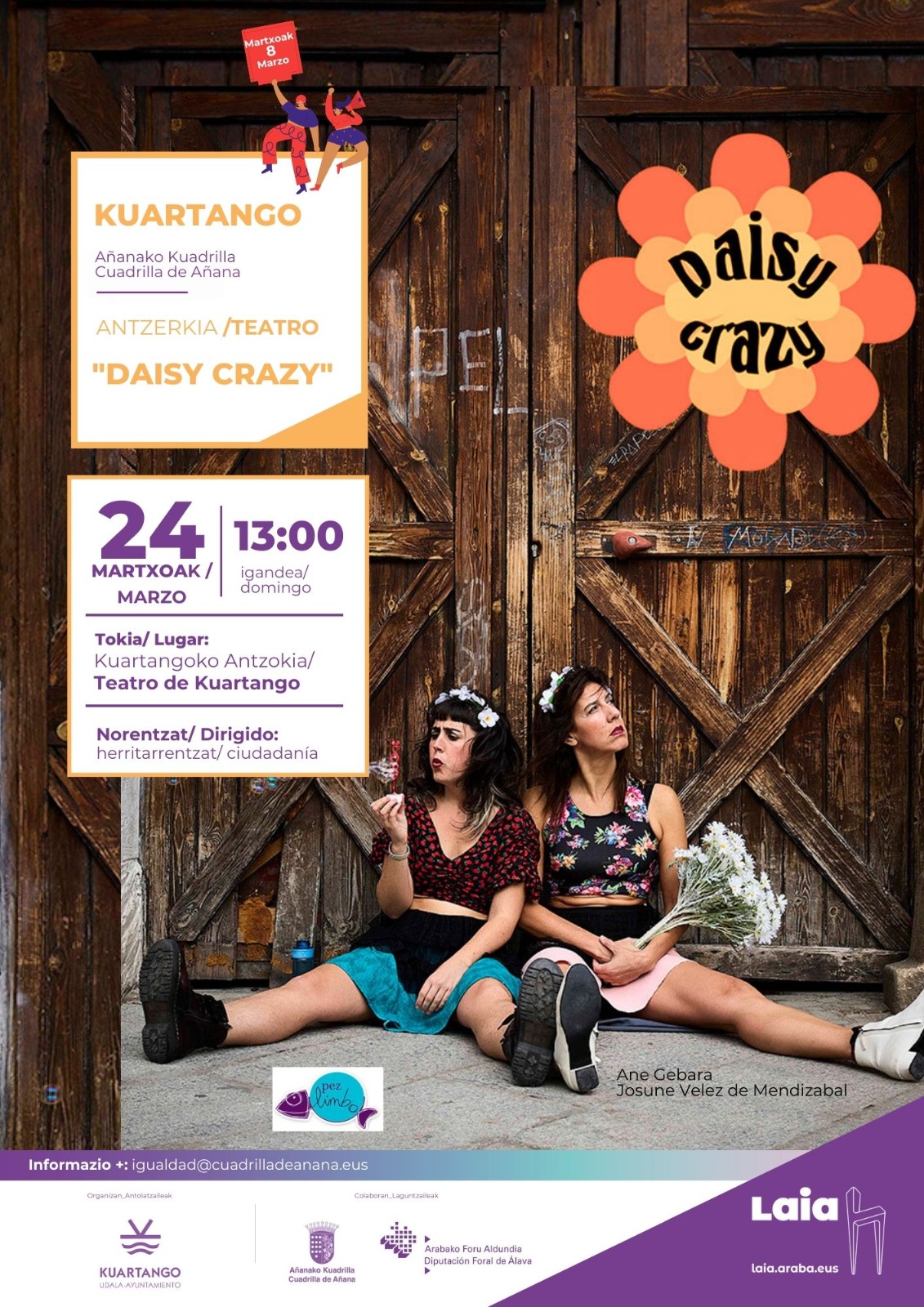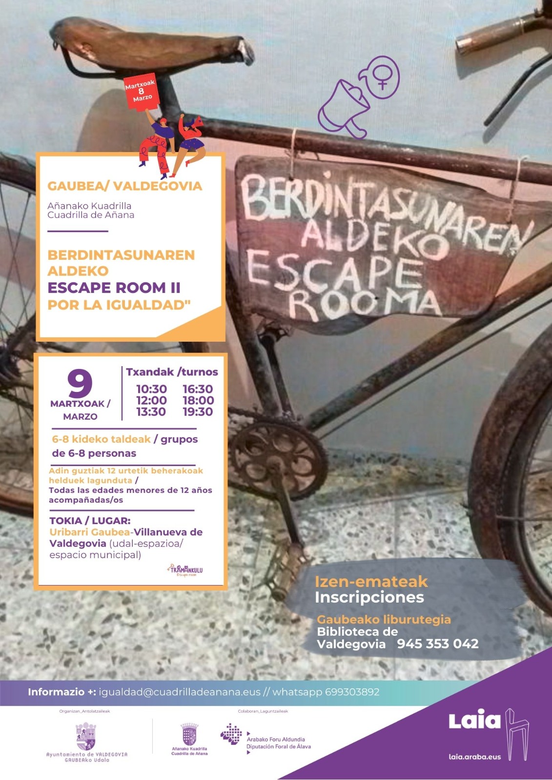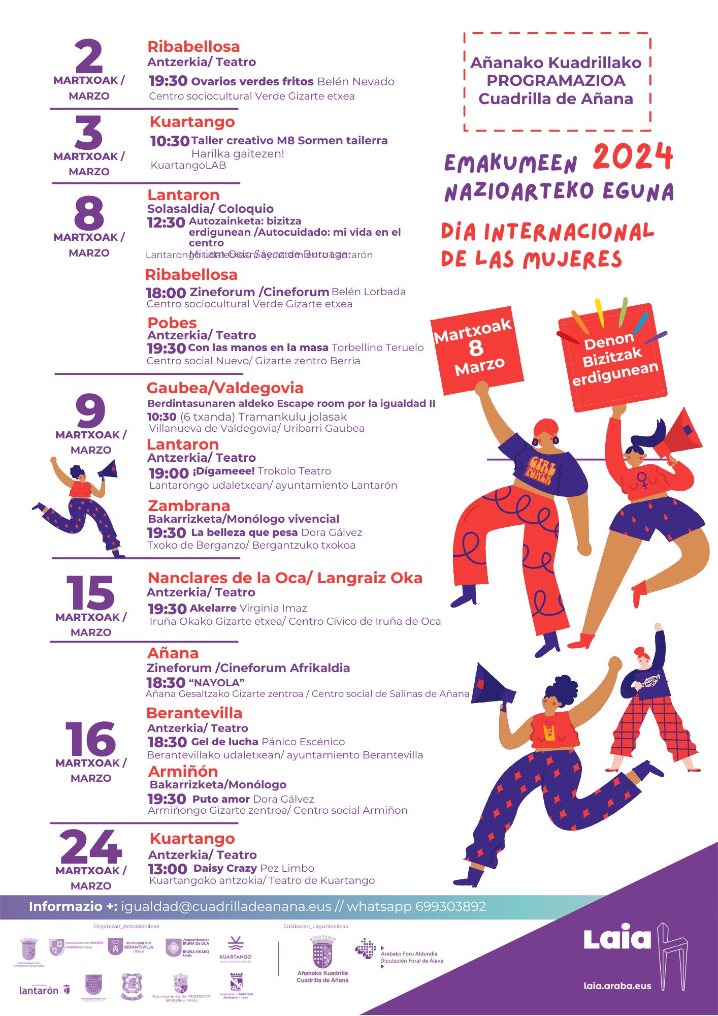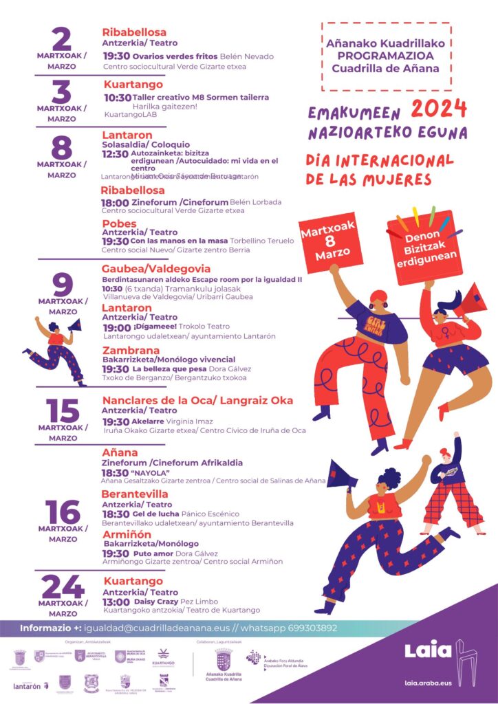 Programación 8M · Cuadrilla de Añana Programación en cada municipio: Armiñón Berantevilla Iruña de Oca Kuartango Lantarón Lantarón Ribera Alta Ribera Baja Añana Valdegovía Zambrana Valdegovía Página web de Laia Araba Categoría: ActividadesPor admin21 de febrero de 2024Deja un comentario Autor: admin http://www.cuadrilladeanana.eus Navegación entre publicacionesAnteriorPublicación anterior:Añanako Kuadrillako Korrika Kultura. Programazio osoaSiguientePublicación siguiente:Udalsarea 2023 · Encuentro comarcalRelated PostsCAMPAÑA 25 DE NOVIEMBRE18 de noviembre de 2024Armiñón fest, sábado 1 de junio27 de mayo de 2024XX. Feria de Kuartango, domingo 12 de mayo3 de mayo de 2024Sábado 11: Cigüeñas en Zambrana y San Isidro en Ribera Alta3 de mayo de 2024Hogares verdes 202415 de abril de 2024Día del mundo rural 2024. Concurso infantil de dibujo.25 de marzo de 2024
